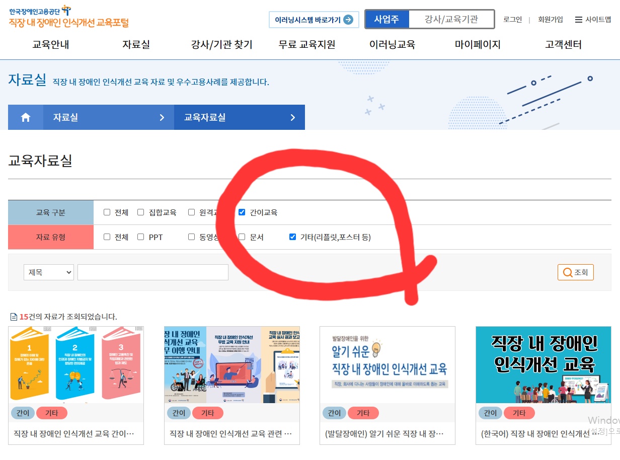 ✔ [ 인식개선교육포털 → 자료실 →교육자료실 → 간이교육, 기타(리플릿, 포스터 등) 체크 → 조회 → 간이교육자료] 다운로드